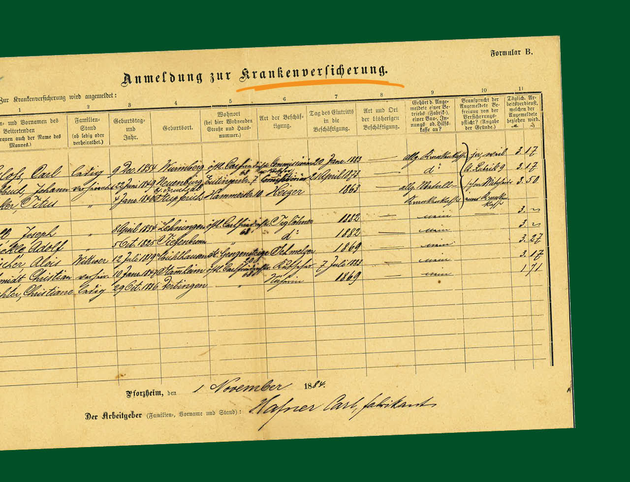 C.HAFNER sorgte stets gut für seine Mitarbeitenden unter anderem in Form von Versicherungs- und Vorsorgeleistungen. Schon Ende des 19. Jahrhunderts meldete C.HAFNER seine Angestellten zur Krankenversicherung an. Das älteste überlieferte Anmeldeformular stammt aus dem Jahr 1884. Aus der Zeit zwischen 1898 und 1906 finden sich im Unternehmensarchiv zudem mehrere Rentenbeitragsbescheinigungen von Mitarbeitenden.